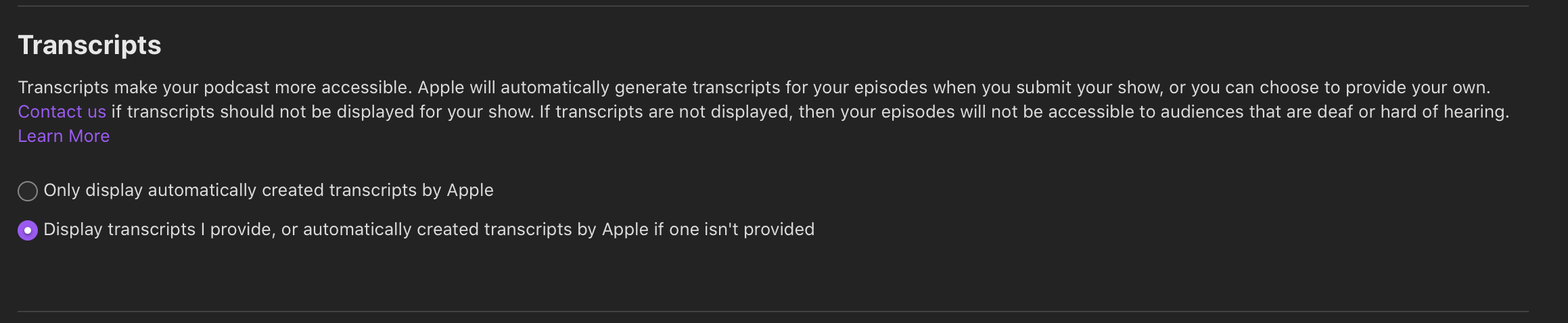ich habe dort die Option an und meine Transkripte werden angezeigt. Ich pflege die einfach über Podlove.