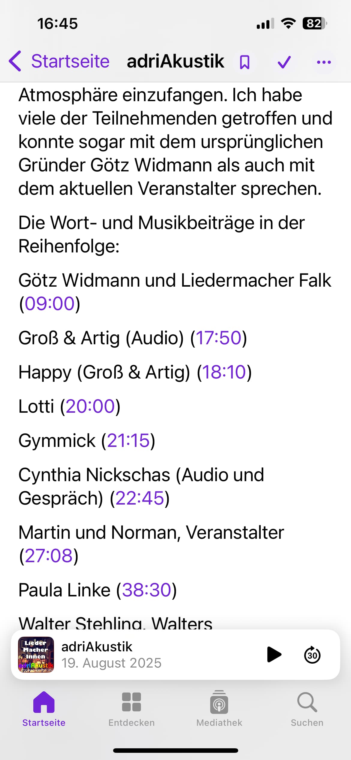 ich wollte gerne etwas teilen, was mir heute aufgefallen ist. Ich habe eine neue Episode meines Podcasts veröffentlicht, und habe in der Sendungsbeschreibung die Interviewpartner mit der (ungefähren) Zeit angegeben, einfach als Text in Klammern (mm:ss). Keine Kapitelmarken in Form einer extra Datei oder eingebettet ins mp3.
