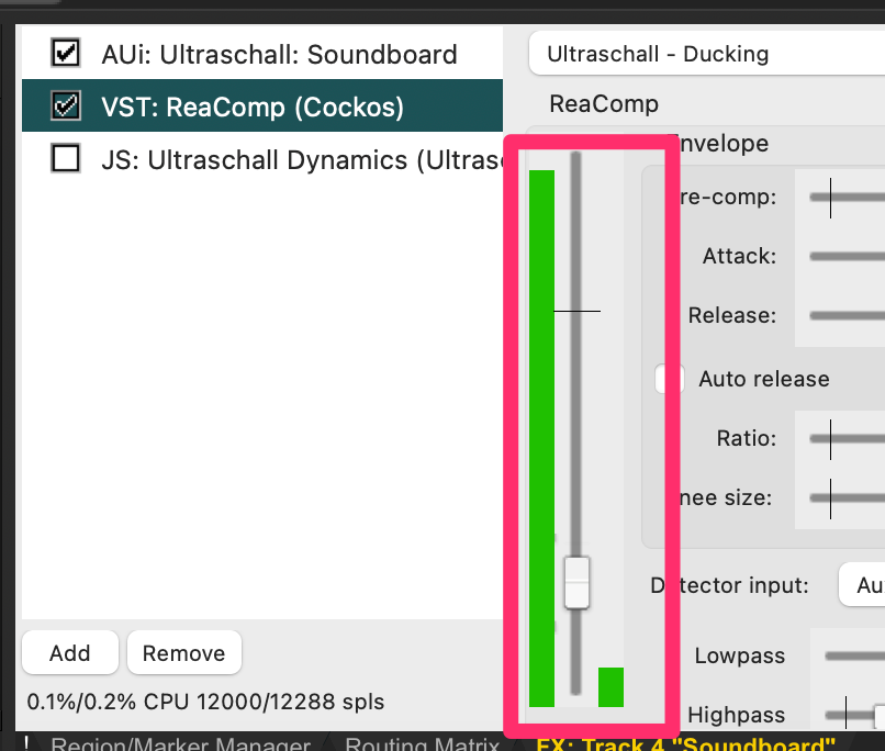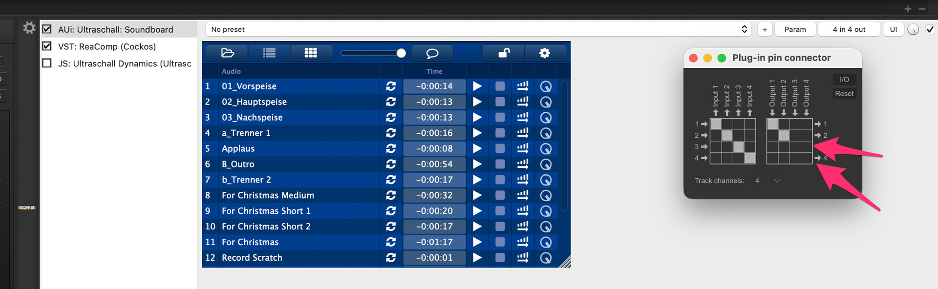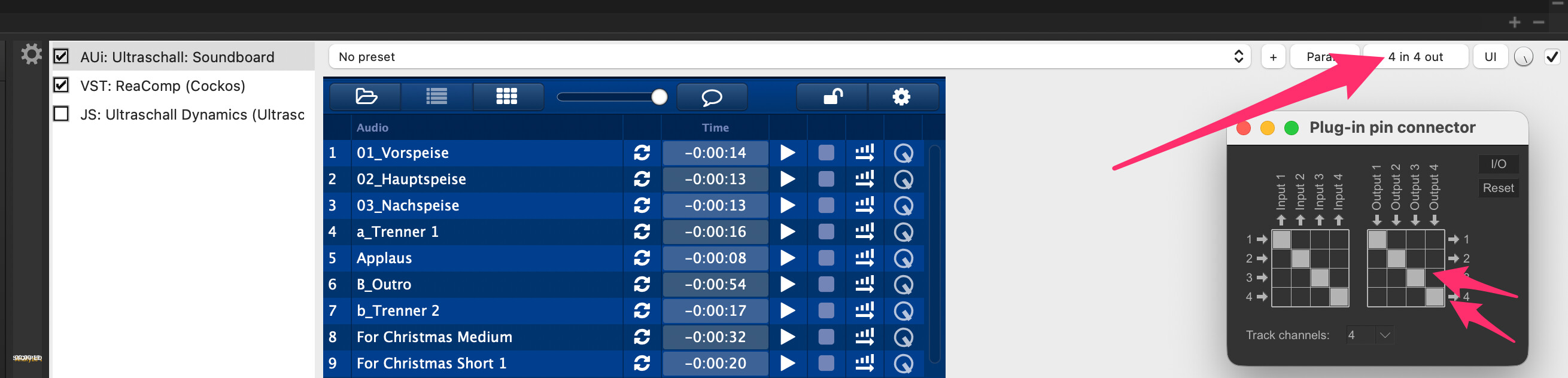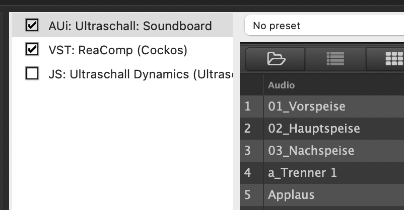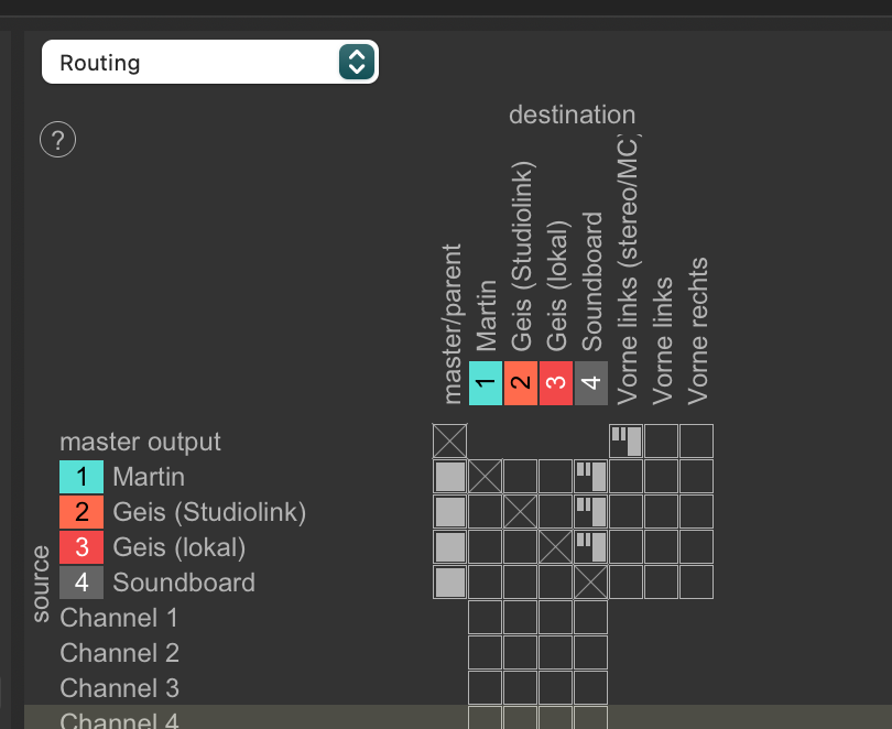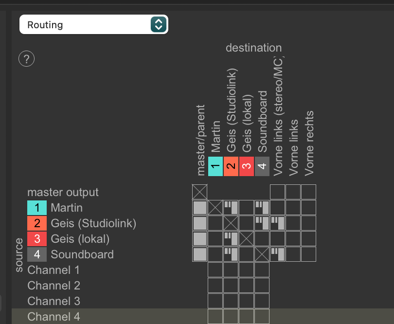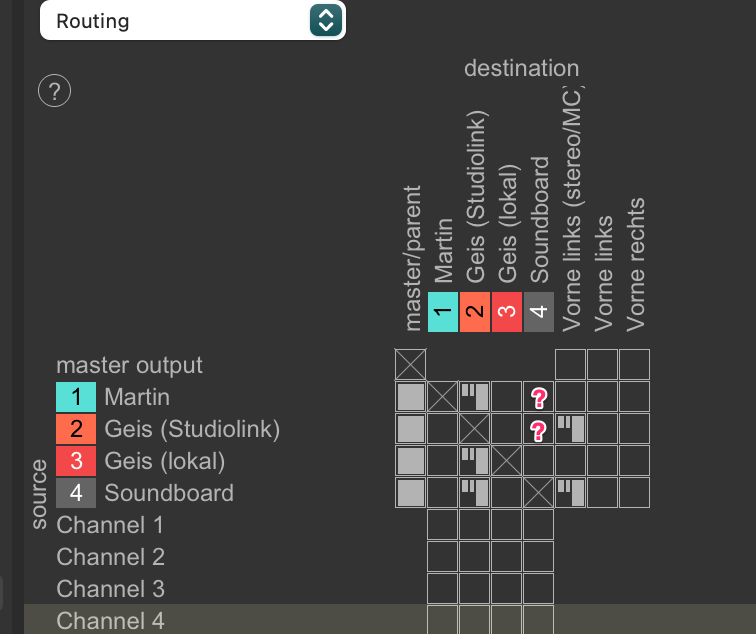 Vorweg: Ich gehe davon aus, dass “Die Anforderung” nach wie vor eine ist, die von Ultraschall unterstützt wird bzw. weiß ich nichts Gegenteiliges. Es gibt einen Indikator, bei dem ich ins Grübeln kam, denn ich hatte erwartet, dass beim Preset-Routing-Recording die Sprecher*innen-Spuren mit dem Send 3/4 auf die Soundboard-Spur für das Ducking gemappt werden, das ist aber nicht so:
