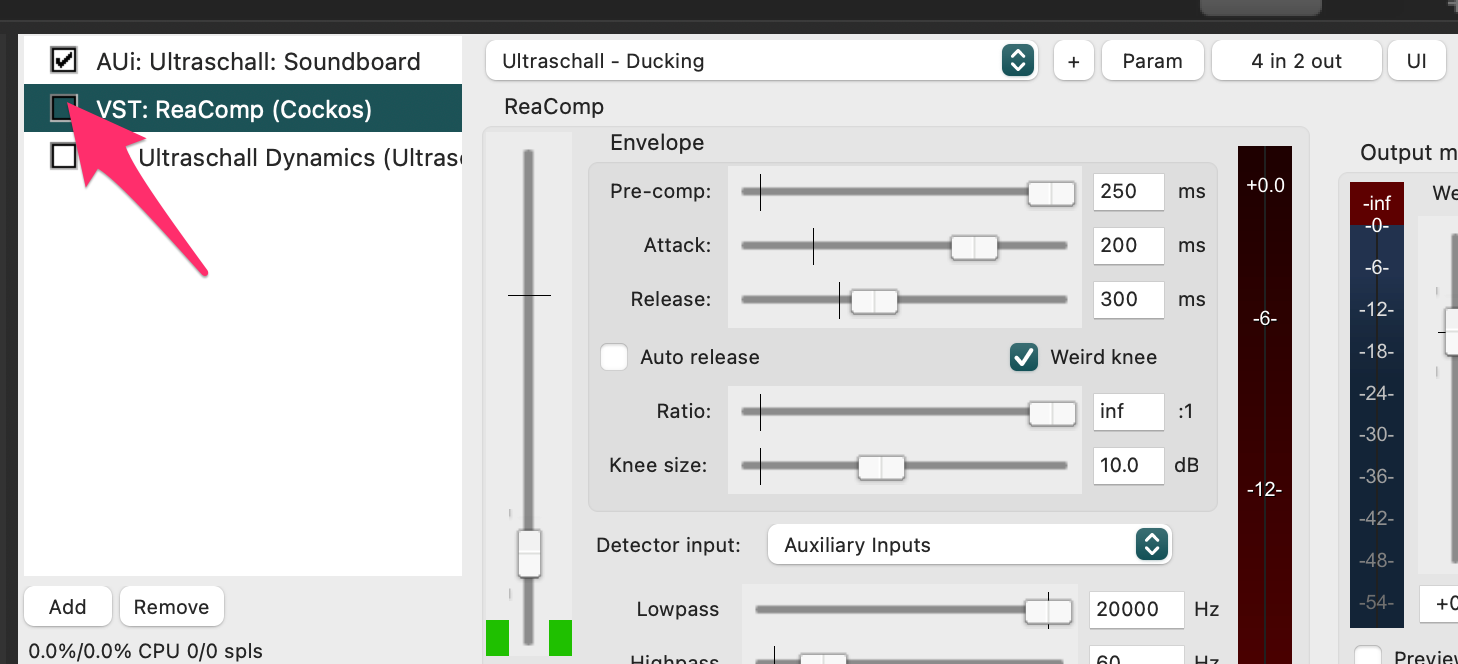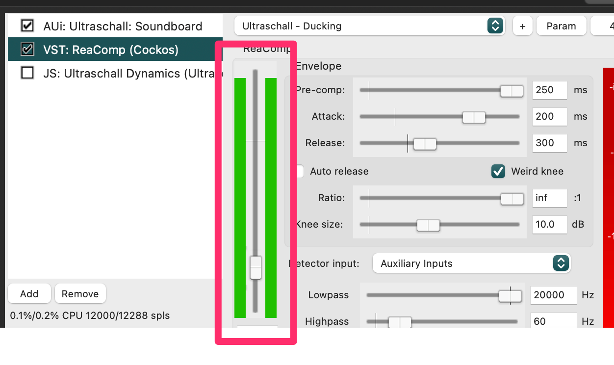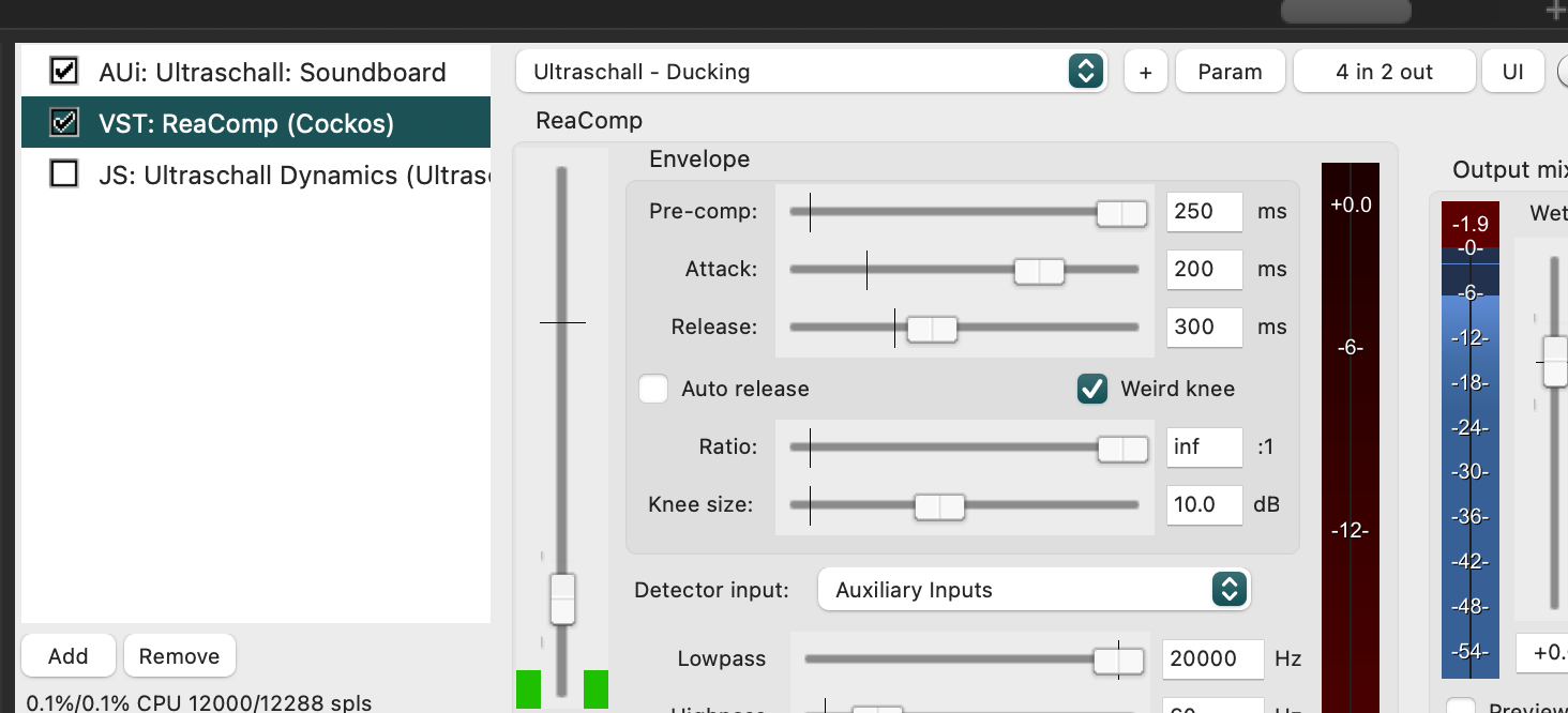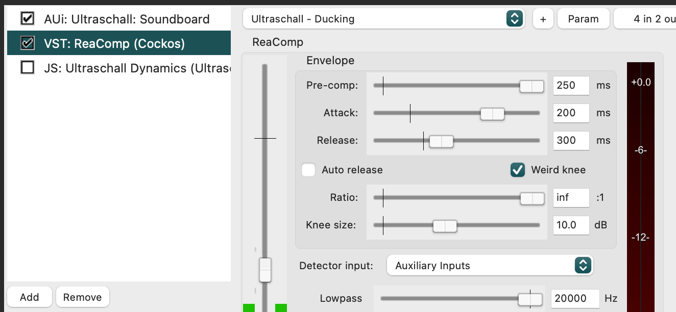 Es funktioniert genau wie beschrieben für wenige Sekunden, dann bricht der Einspieler ab und das Ducking zeigt konstant diesen Ausschlag auf der Skala: