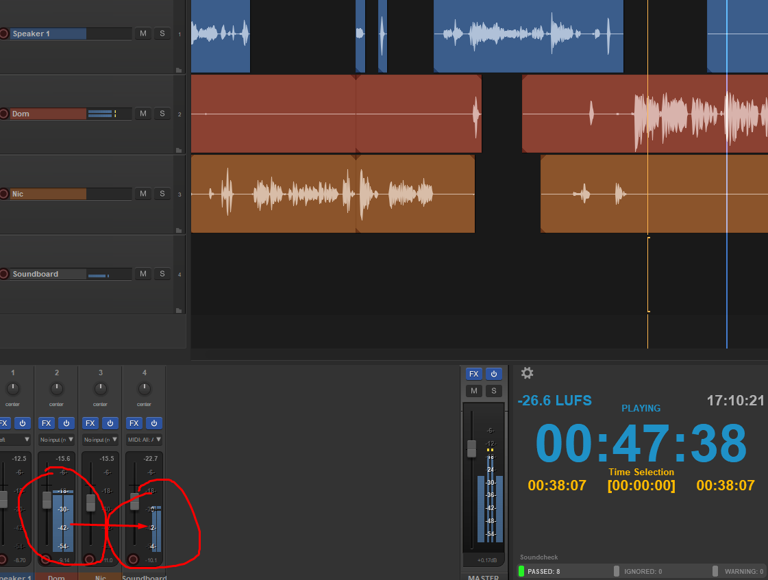 Sobald dieser Send weg ist, sollte der Soundboard-Fader nicht mehr mit ausschlagen, wenn Dom redet.