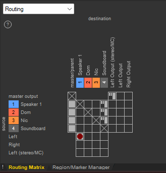 Die Matrix sieht sauber aus – also da scheint nichts falsch verkabelt zu sein. Alle Spuren gehen normal in den Master, und ich sehe keinen offensichtlichen Send von Dom ins Soundboard. Das heißt: Das Problem ist sehr wahrscheinlich nicht die Routing Matrix selbst.
