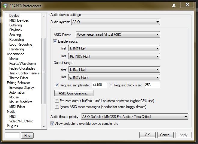 Für meine Headsets arbeite ich in Reaper unter den Audio Device Einstellungen über ASIO mit VB-Audio Voicemeeter, für den Rechnersound mit VB-Audio Voicemeeter AUX. Leider kriege ich es nicht gebacken beides in 2 verschiedenen Spuren aufzuzeichnen.
